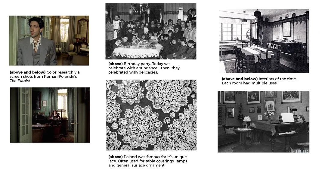 It is November 1939 and Misha has come to a birthday party. Interiors say so much about the times and the people that live in them. Most interiors were cluttered by today’s standards. Given how many things we could incorporate in this scene, we had to be careful to choose the right ones. Ones with significance. A) photos in the background are from the United States Holocaust Memorial Museum collection. They are photos of families a lot like the Milgroms, many of whom perished in the war. But, in this scene, they would still be very much alive. We are hoping to form a partnership with various Holocaust organizations so that we can include parts of their collections in our film. Poland was famous for its crystal. You can see it in the vase and the cake stand. C) Poland was also famous for its lace D) Persian carpets were used in abundance. Misha and the boys would also use a Persian carpet to sleep in the rubble in cold weather. Carpets were available from bombed-out homes. E) there was no such thing as “wrapping paper” as we know it today. Gifts were wrapped in parcel paper or newspaper. Here we use a page from Dziennik Poznanski in 1939. This long-running Polish newspaper ceased operation that year and would be replaced by Nazi propaganda. F) Families often displayed plates and favorite trinkets. Here we see a little glass dog that Janina would later leave for Misha on her stoop.